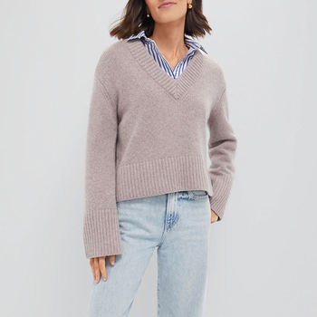 Tops de punto personalizados OEM de manga larga para mujer, nuevo jersey de Color sólido, cómodo suéter con cuello en V para mujer, ropa de salón