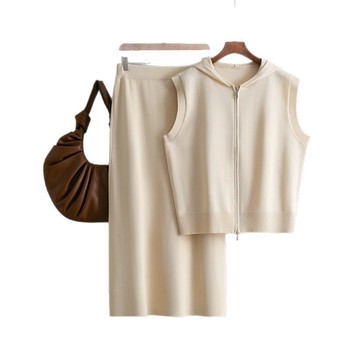 Nuovo Cardigan gilet lavorato a maglia con cappuccio da donna gonna alla moda Set due pezzi con cerniera larga